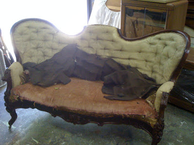 The couch as you can see is from a little bit different time period for starters. But it has some beautiful detail as you can see from the first picture. There is a piece of carving that goes at the top of the back in the center, you will see that in the after picture.